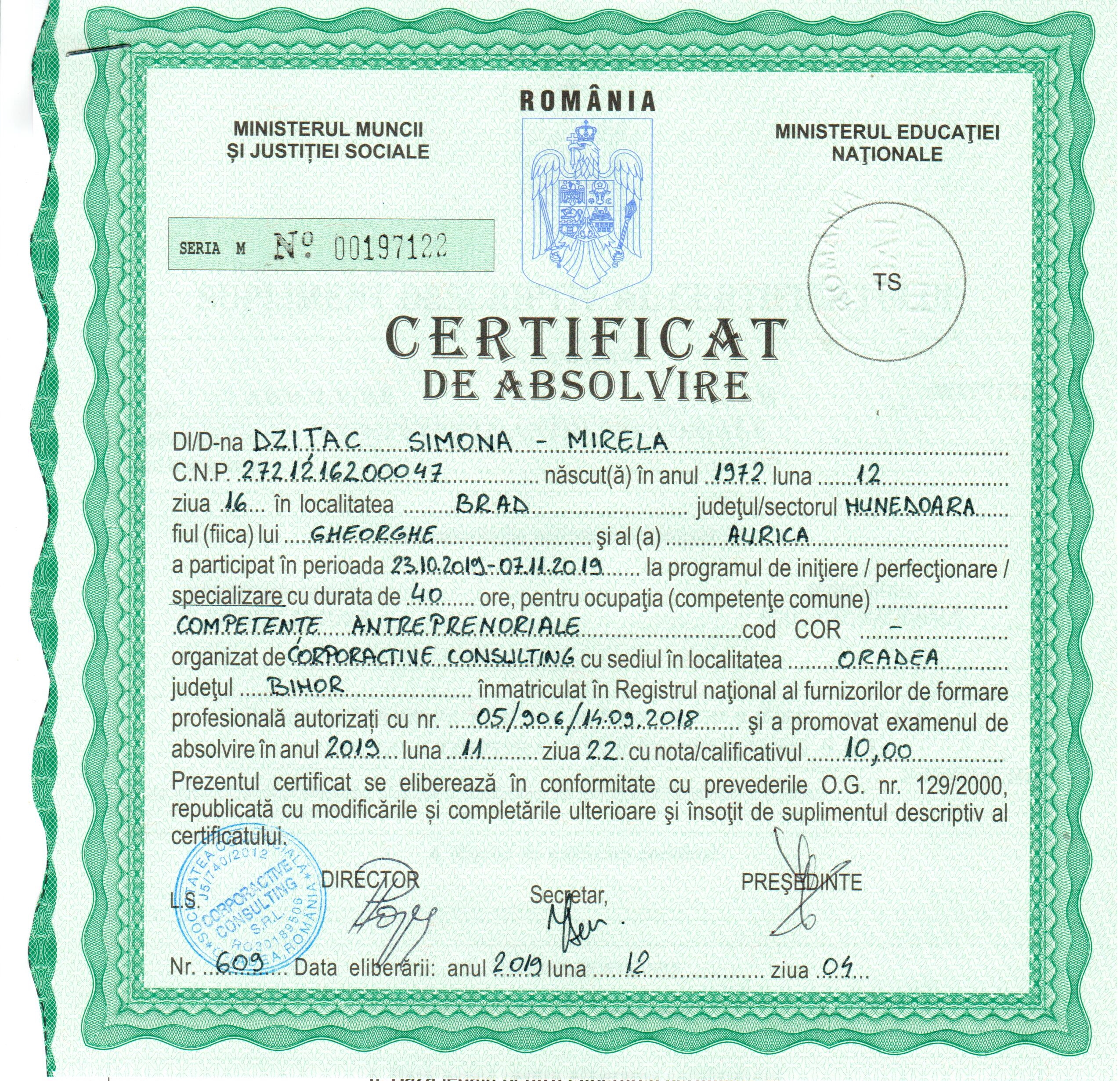 - Certificat de absolvire al programului de specializare Competenţe antreprenoriale , organizat de Corporactive Consulting, perioada 23.10.2019 – 07.11.2019;